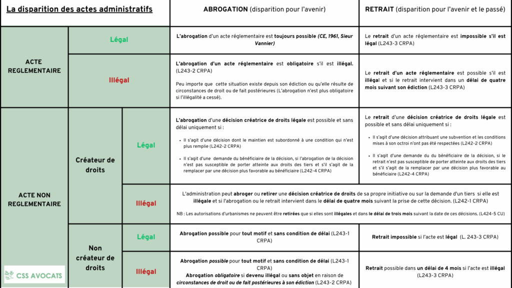 Voyons ici les règles de disparition d’un acte par l’action de l’administration, reprenant les articles L241-1 et suivants du code des relations entre le public et l’administration (CRPA) relatifs au régime de sortie de vigueur des actes administratifs :